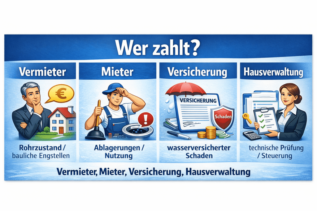 - Vermieter: eher zuständig, wenn Rohrzustand, Gefälle oder bauliche Engstellen ursächlich sind.
