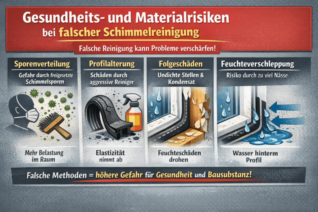 Falsche Reinigung ist nicht nur ein optisches Problem, sondern kann Sporen verteilen und das Bauteil dauerhaft schwächen. Wer trocken bürstet oder stark scheuert, löst Partikel, die sich im Raum absetzen, und erzeugt gleichzeitig Mikrokratzer, in denen Feuchte länger stehen bleibt. Dadurch steigt die Wahrscheinlichkeit, dass sich der Befall an derselben Stelle erneut entwickelt.
