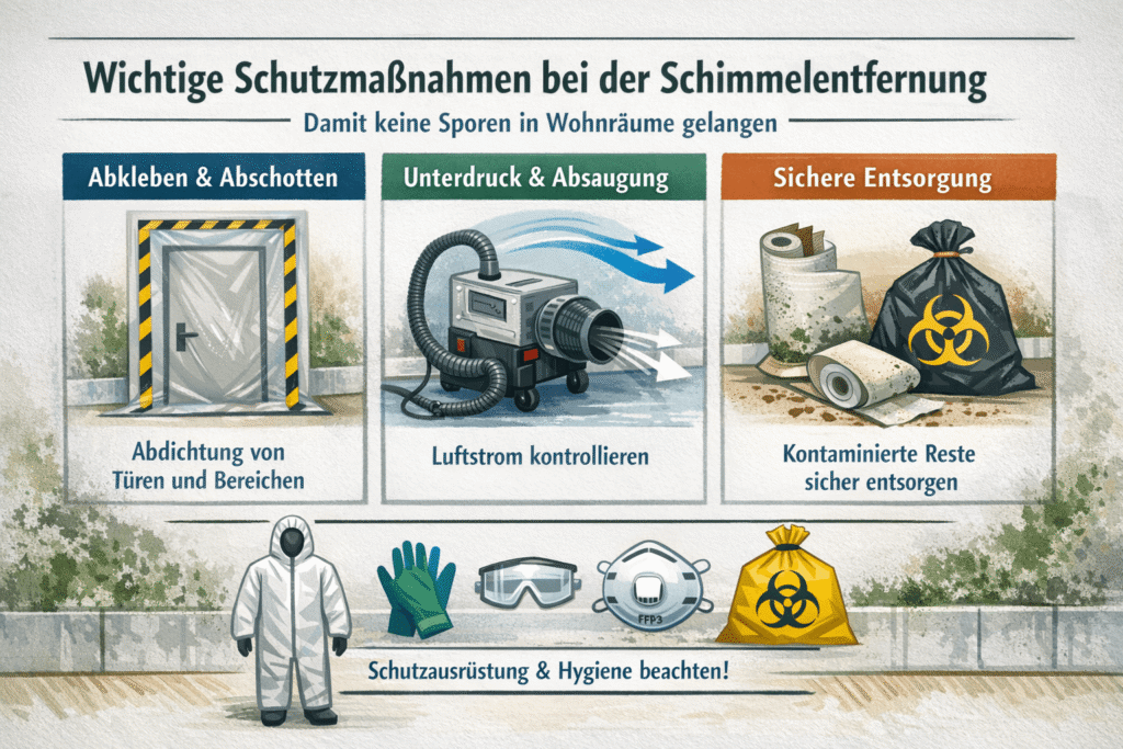 Die fachgerechte Entfernung beginnt mit der Kontrolle, ob Sporen beim Arbeiten in andere Räume getragen werden könnten. Danach wird der Bereich so vorbereitet, dass Reinigungs- und Desinfektionsschritte die Oberfläche erreichen, ohne angrenzende Bauteile zu beschädigen.