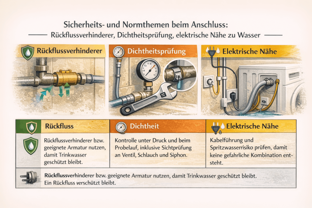 Sicherheits- und Normthemen beim Anschluss: Rückflussverhinderer, Dichtheitsprüfung, elektrische Nähe zu Wasser