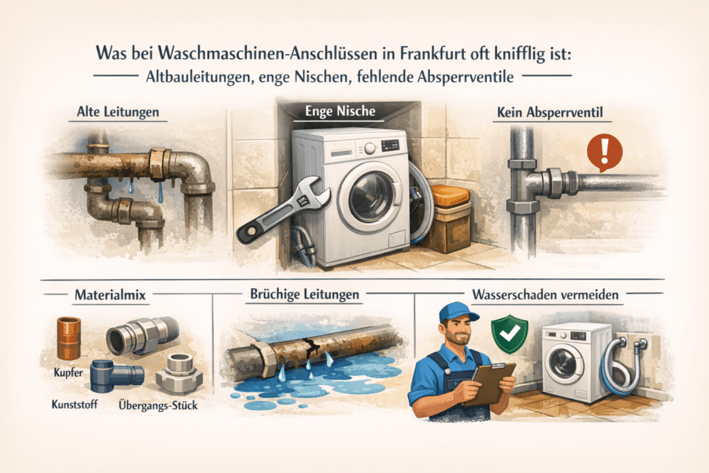 Klempner Waschmaschine anschließen Kosten – Was bei Waschmaschinen-Anschlüssen in Frankfurt oft knifflig ist: Altbauleitungen, enge Nischen, fehlende Absperrventile