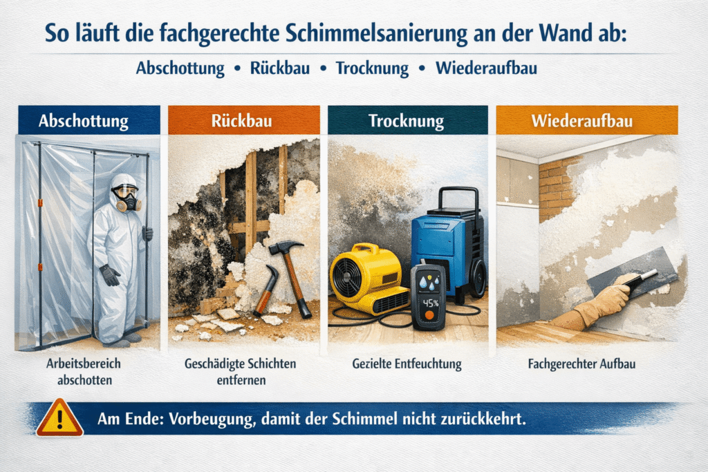 So läuft die fachgerechte Schimmelsanierung an der Wand ab: Abschottung, Rückbau, Trocknung, Wiederaufbau