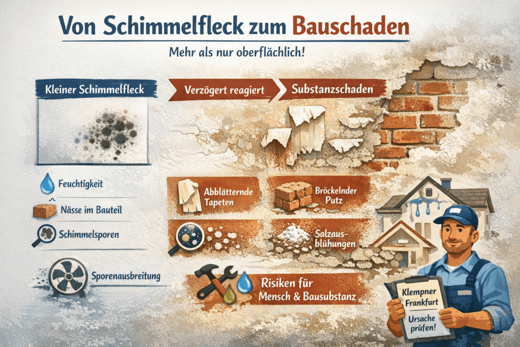 Ein kleiner Befall bleibt selten ein reines Oberflächenproblem, weil hinter dem sichtbaren Bereich oft Feuchte im Bauteil steht. Entscheidend ist, ob der Putz trocken ist oder ob Wasser aus Leckage, Kondensat oder kapillarer Durchfeuchtung nachliefert. Sobald Material weich wird, sich Tapeten ablösen oder Salzausblühungen auftreten, verschiebt sich die Bewertung in Richtung Substanzschaden.