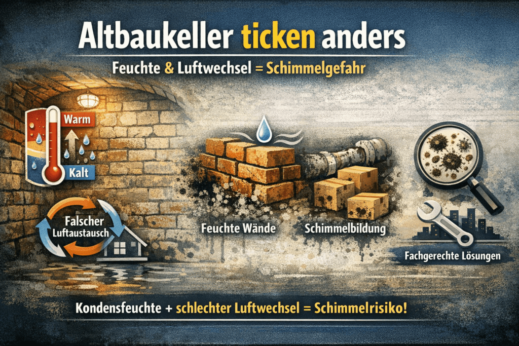 Altbaukeller bestehen häufig aus massivem Mauerwerk, das Feuchte nicht „abschließt“, sondern puffert und zeitverzögert wieder abgibt. Kommt warme Außenluft in einen kühlen Keller, fällt Wasser als Kondensat an den kältesten Flächen aus; dadurch entstehen lokal dauerhaft feuchte Zonen.