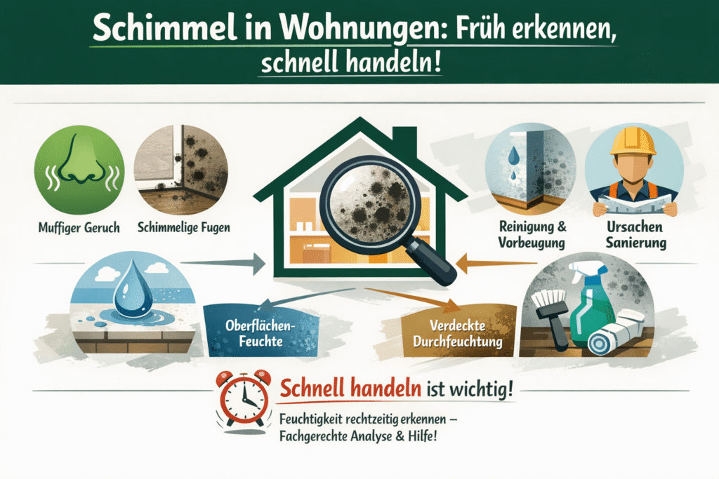 Am Anfang sind es selten großflächige Flecken, sondern kleine Hinweise: ein muffiger Geruch nach dem Lüften, dunkle Punkte an Silikonfugen oder eine Ecke, die sich ständig klamm anfühlt. Solche Zeichen entstehen, wenn Feuchte länger auf einer Oberfläche oder in einem Bauteil steht und sich dort ein Mikroklima bildet.