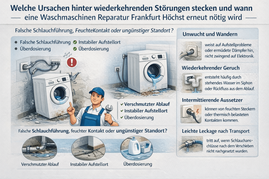 Wenn gleichzeitig ein Neuanschluss oder eine Umpositionierung des Geräts nötig wird, ist die Anschlusslogik wie bei waschmaschine anschließen frankfurt fachlich relevant, damit Zu- und Ablauf später nicht unter Spannung stehen oder knicken.